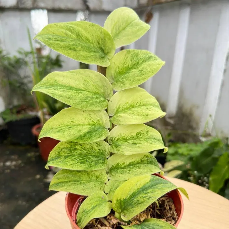 The Rhaphidophora Korthalsii Variegated is a stunning tropical climber known for its large, fenestrated leaves adorned with unique cream-white variegation. This rare variety adds elegance and a pop of brightness to any indoor jungle. Thriving in bright, indirect light and high humidity, it’s a prized plant for collectors seeking both beauty and rarity in their collection.